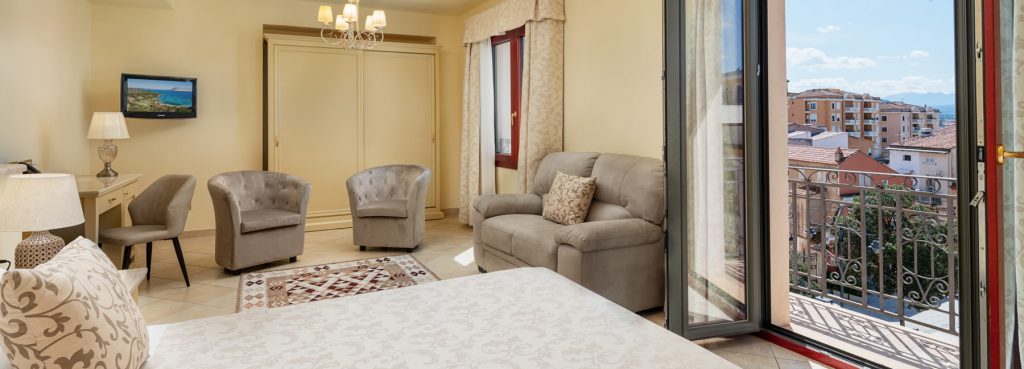 1 - 3 persone | 40 mq Le Junior Suite sono ubicate al secondo e terzo piano, si affacciano con un balcone sulla centralissima Piazza Matteotti, hanno una superficie di circa 40 mq e possono ospitare fino a 3 persone. Sono dotate di una spaziosa camera con letto matrimoniale king size, un ampio bagno con doccia e da una grande e comoda zona living con divano e poltrone.